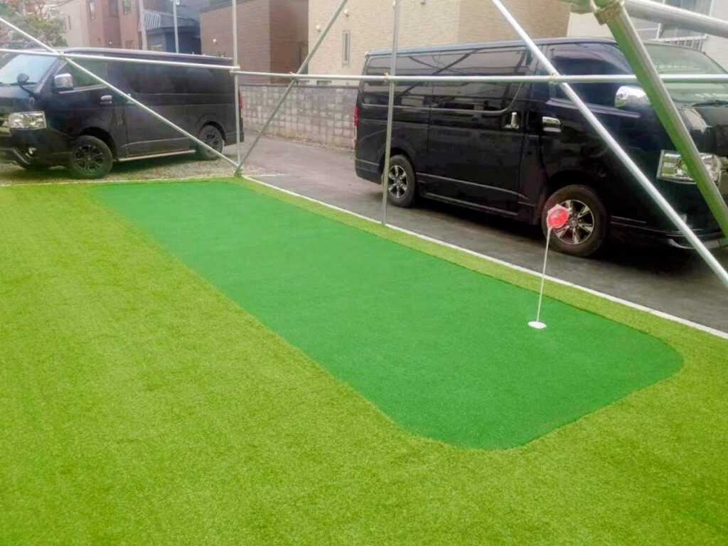 人工芝の一部はゴルフ用人工芝を敷き、パター練習を行えるようカップを切りました。