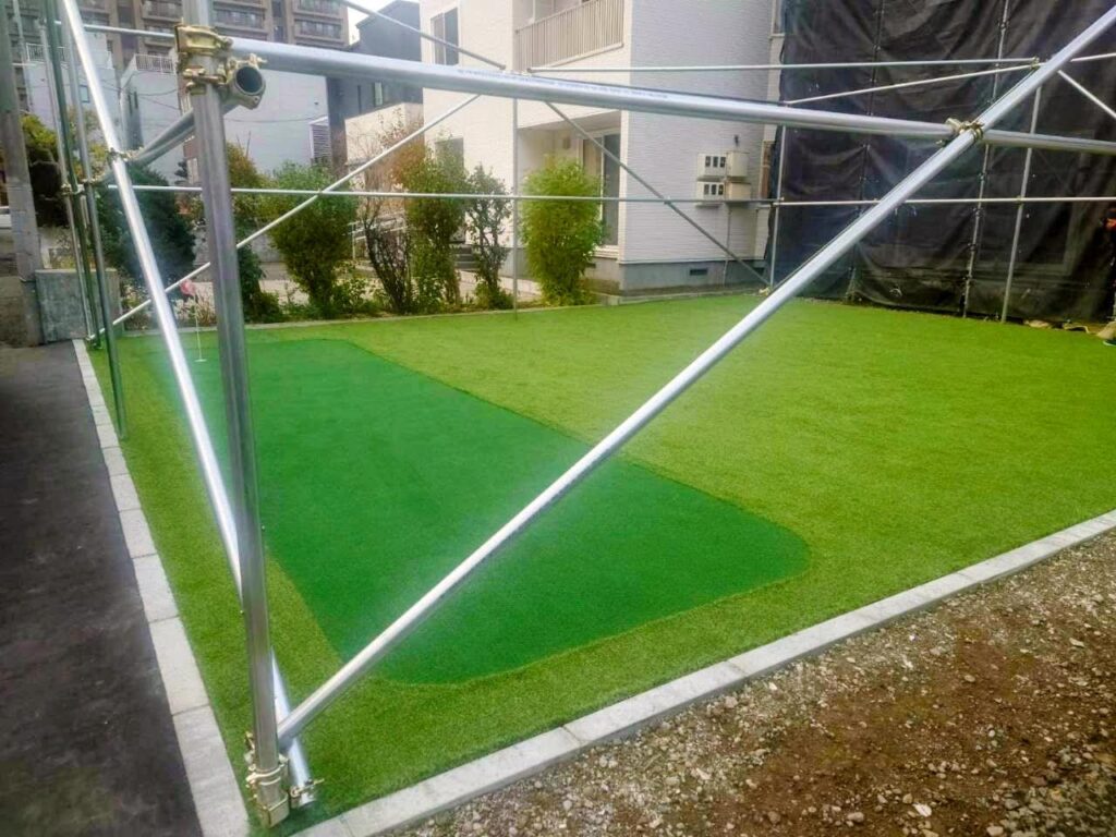 ということで、防球ネットの設置と、人工芝を敷設致しました。