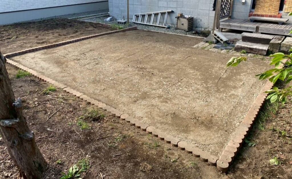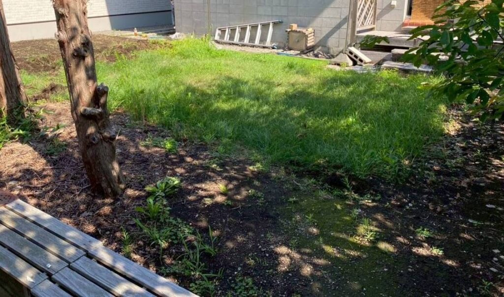 雑草を丁寧に取り除き、整地後に防草シートを敷いたのち人工芝を敷きました。